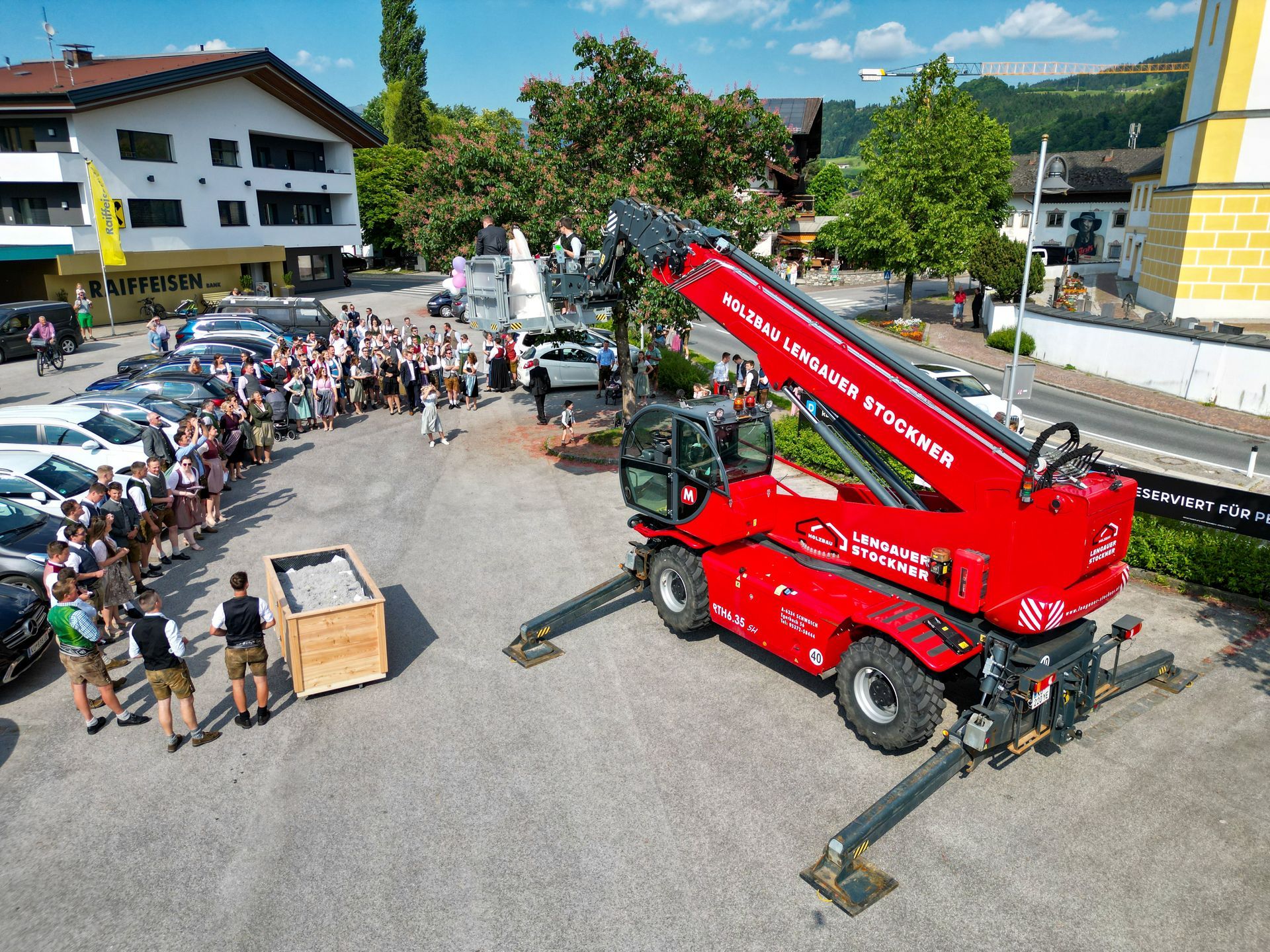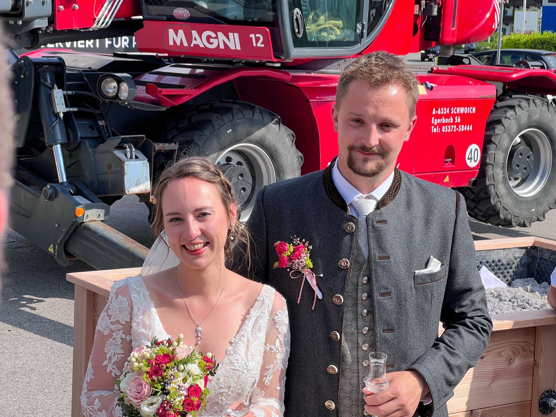 Nach einer kurzen Verschnaufpause ging es Ende Juni aber direkt weiter zur Hochzeit von unserem Werkstattleiter Martin und seiner Silvia. Martin heiratete seine Silvia in der Pfarrkirche Schwoich mit atemberaubender musikalischer Umrahmung durch die Musikkapelle Schwoich. Standesgemäß brachten wir unseren Werkstattleiter und seine Braut mit dem Stapler zum Sektempfang. Gemeinsam feierten wir die beiden in einer traumhaft geschmückten Scheune.