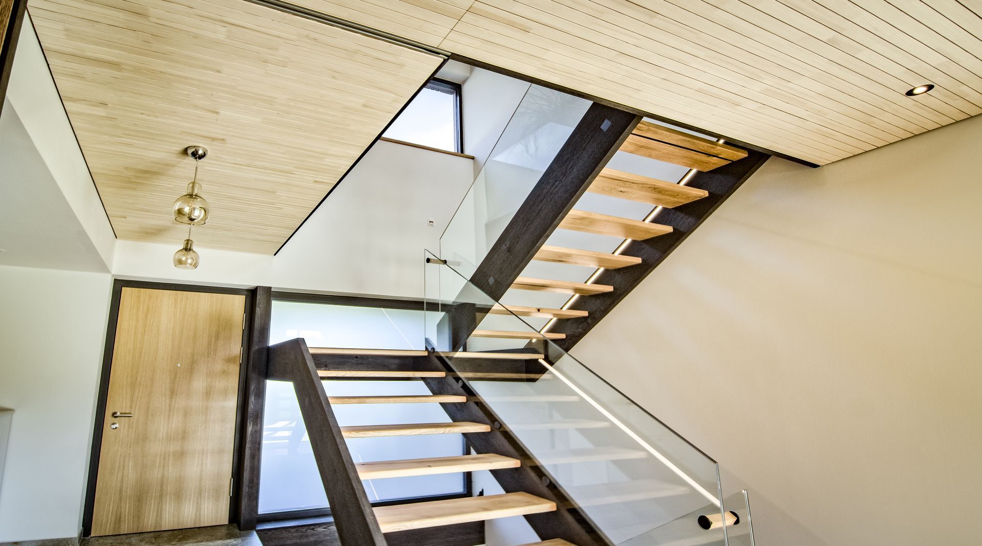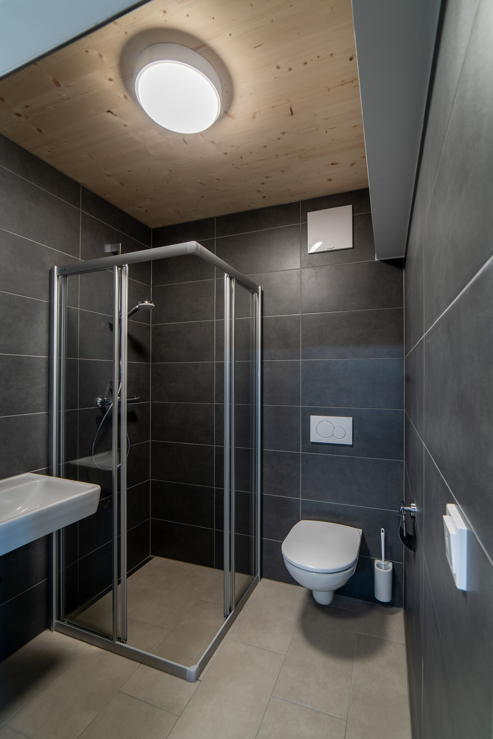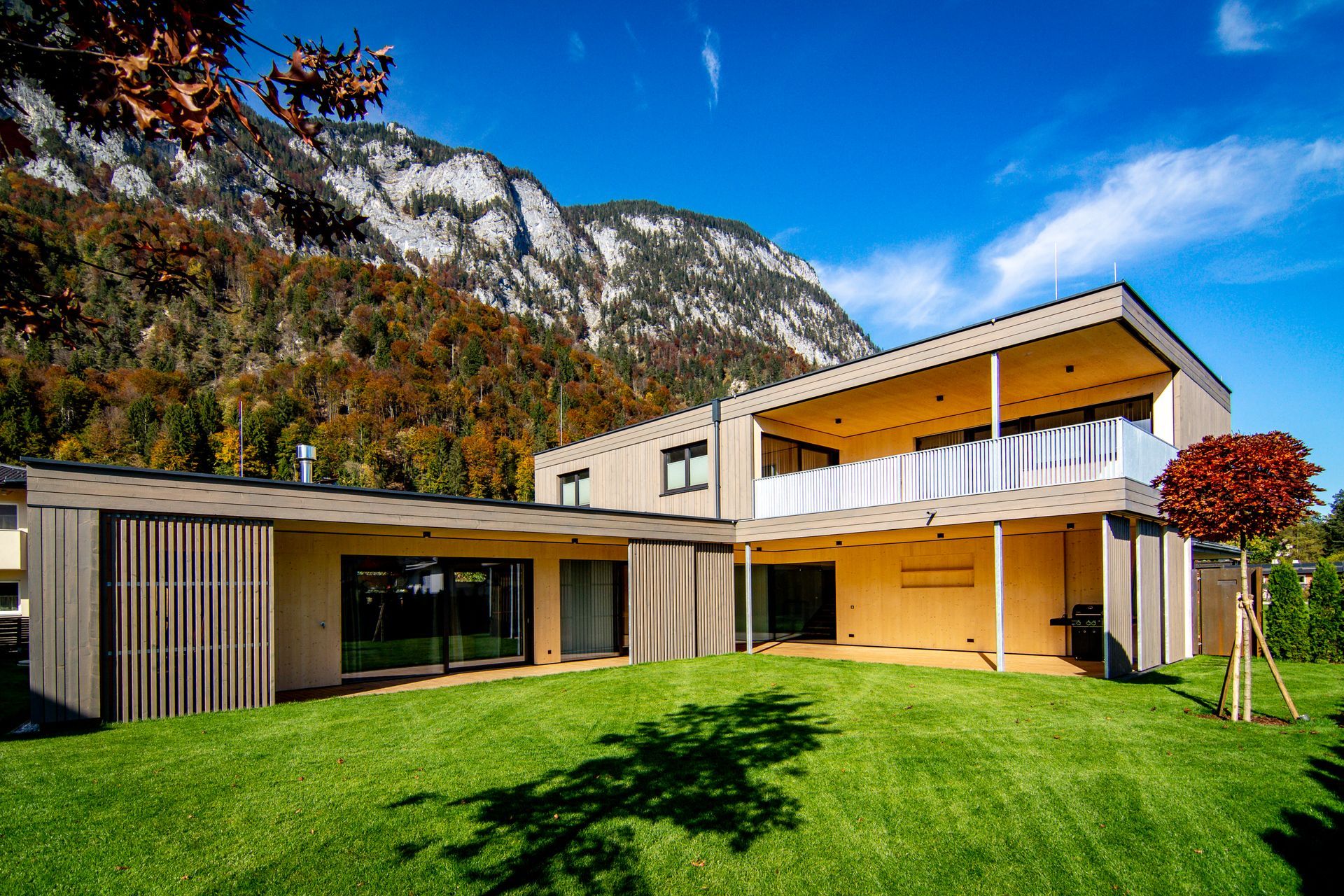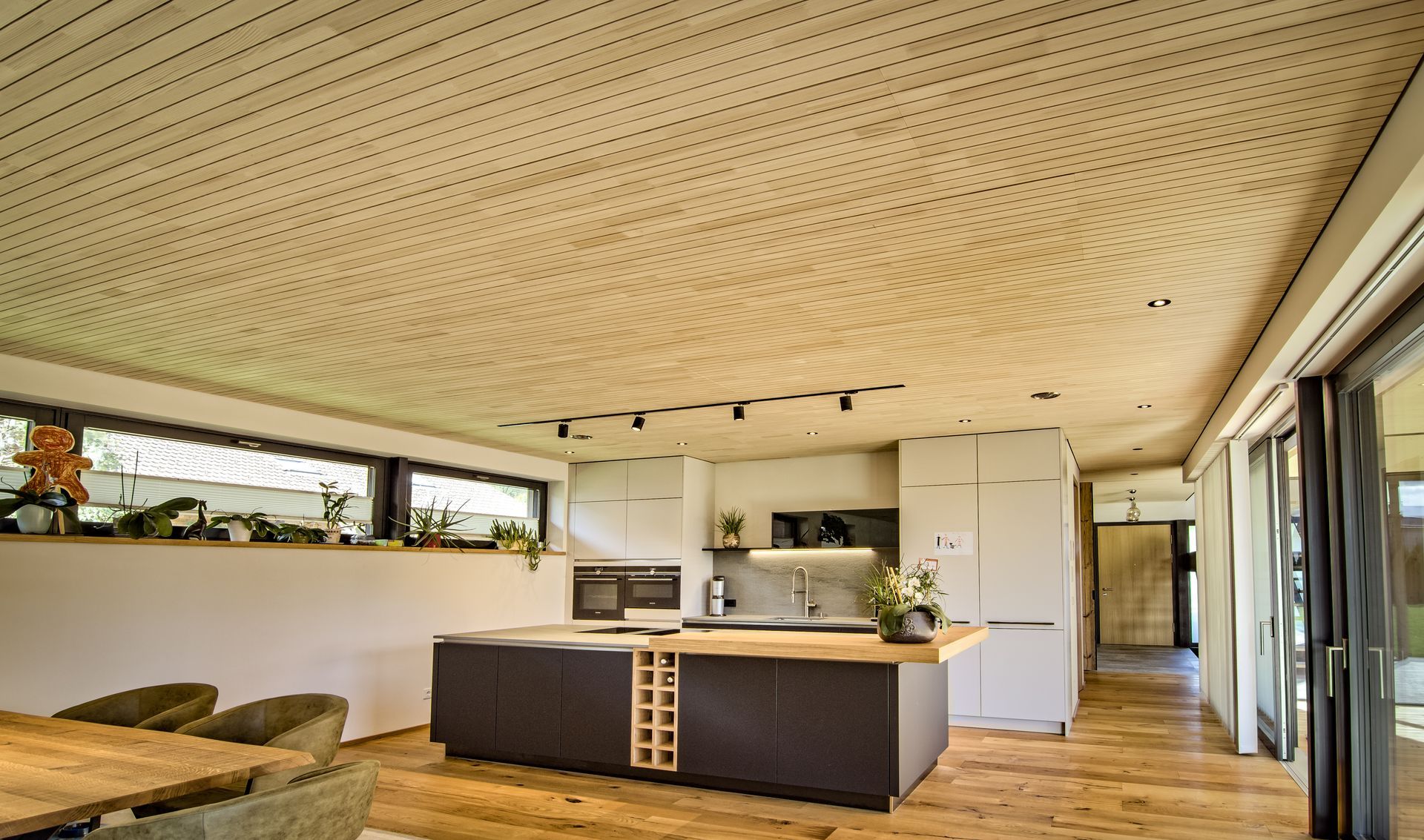 Das Einfamilienhaus in der Gemeinde Langkampfen steht in einer heterogenen Einfamilienhaus-Siedlung. Fächerförmig öffnet sich das Haus nach Westen, schützt vor Einblicken aus der Nachbarschaft und rahmt zusammen mit Hecken und Bäumen den Garten ein. Erdgeschoßig sind neben überdachten Abstellplätzen und Nebenräumen der Ess- und Wohnbereich situiert. Weit ausladende Vordächer und zusätzlich montierte Schiebeelemente an den Vordachkanten schützen vor Sonneneintrag und schaffen, zum ansonsten sehr offenen Erdgeschoß, die Möglichkeit Transparenzen je nach Stimmung, Jahres- oder Tageszeit unterschiedlich zu gestalten. Im privaten Obergeschoß wird gearbeitet und geschlafen, eine großzügig überdachte Terrasse verbindet Kinderzimmer mit Büro und öffnet den Raum nach Südwesten. Neben den erdberührenden Gebäudeteilen im UG und teilweise im Carportbereich wurde das Gebäude in Holzriegelbauweise mit Massivholdecken errichtet. Die Fassade wurde in den bewitterten Bereichen aus lasiertem Lärchenholz und in den geschützten Bereichen aus 3-Schichtplatten in Fichte ausgeführt. Eine PV-Anlage garantiert zusammen mit einer Erdwärmepumpe eine zeitgemäße Energieversorgung.