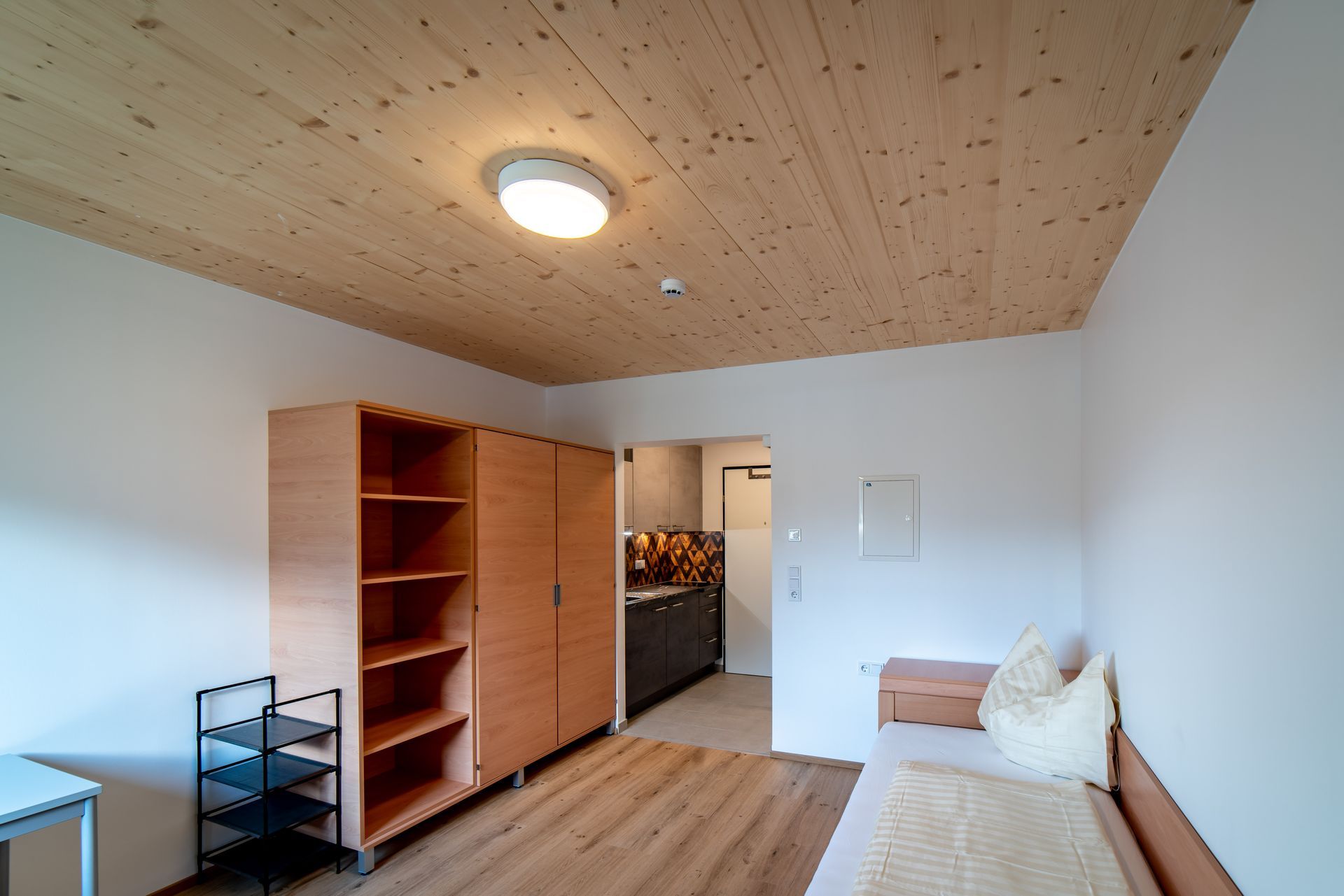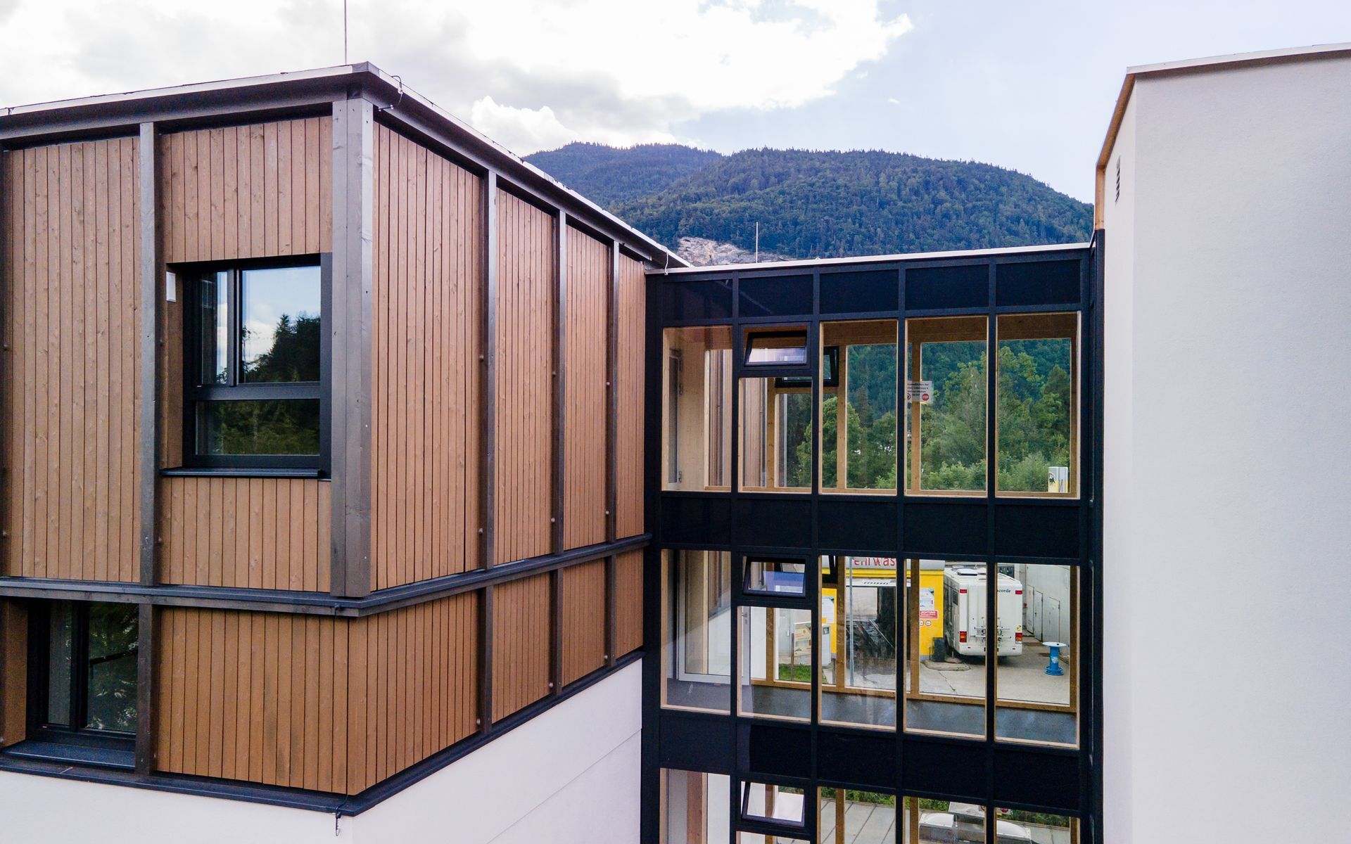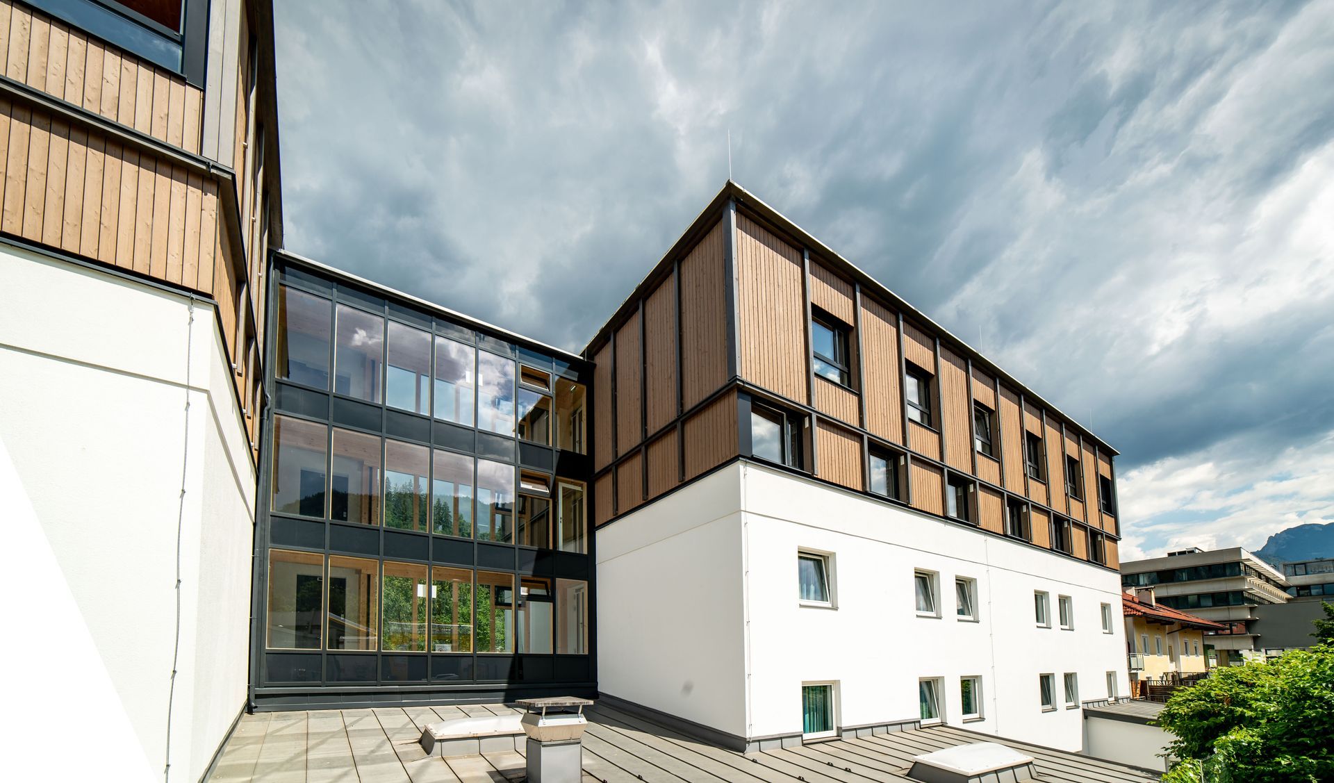 Die Fachhochschule Kufstein wächst und entwickelt sich innovativ weiter. Mit steigender Studentenzahl wächst auch die Nachfrage von bezahlbarem studentischem Wohnraum. Dementsprechend war die nächste logische Weiterentwicklung der FH-Infrastruktur die Erweiterung des Studentenwohnheimes. Es entstanden weitere 44 Wohneinheiten für die jungen Erwachsenen. Um keine weiteren Grundstücksflächen anzuschaffen, wurden die beiden Walmdächer des bestehenden Studentenwohnheims abgetragen und um zwei zweigeschoßige Aufstockungen aus Holz ergänzt. Der Erschließungsbereich im Erdgeschoß wurde vollkommen neugestaltet, und um einen Personenaufzug zwischen den Gebäuden ergänzt, welcher über eine Brücke aus Holz und Glas die oberirdischen Geschoße erschließt. Die Fassade der neu erbauten Geschoße wurde zur Gänze in Holz ausgeführt. Durch die wechselseitige Anordnung der Fenster und der stehenden und liegenden Lisenen entsteht eine sehr klar gegliederte Fassade. Durch Fassadenfertige Vorfertigung der Außenwände mit Fenster, Lüftungs- und Elektrotechnik gelang es das Gebäude großteils ohne Fassadengerüst zu montieren.