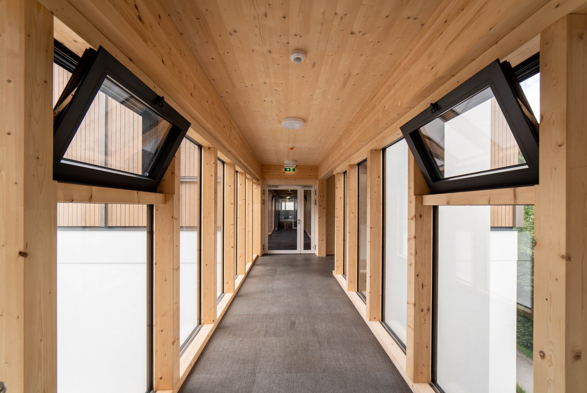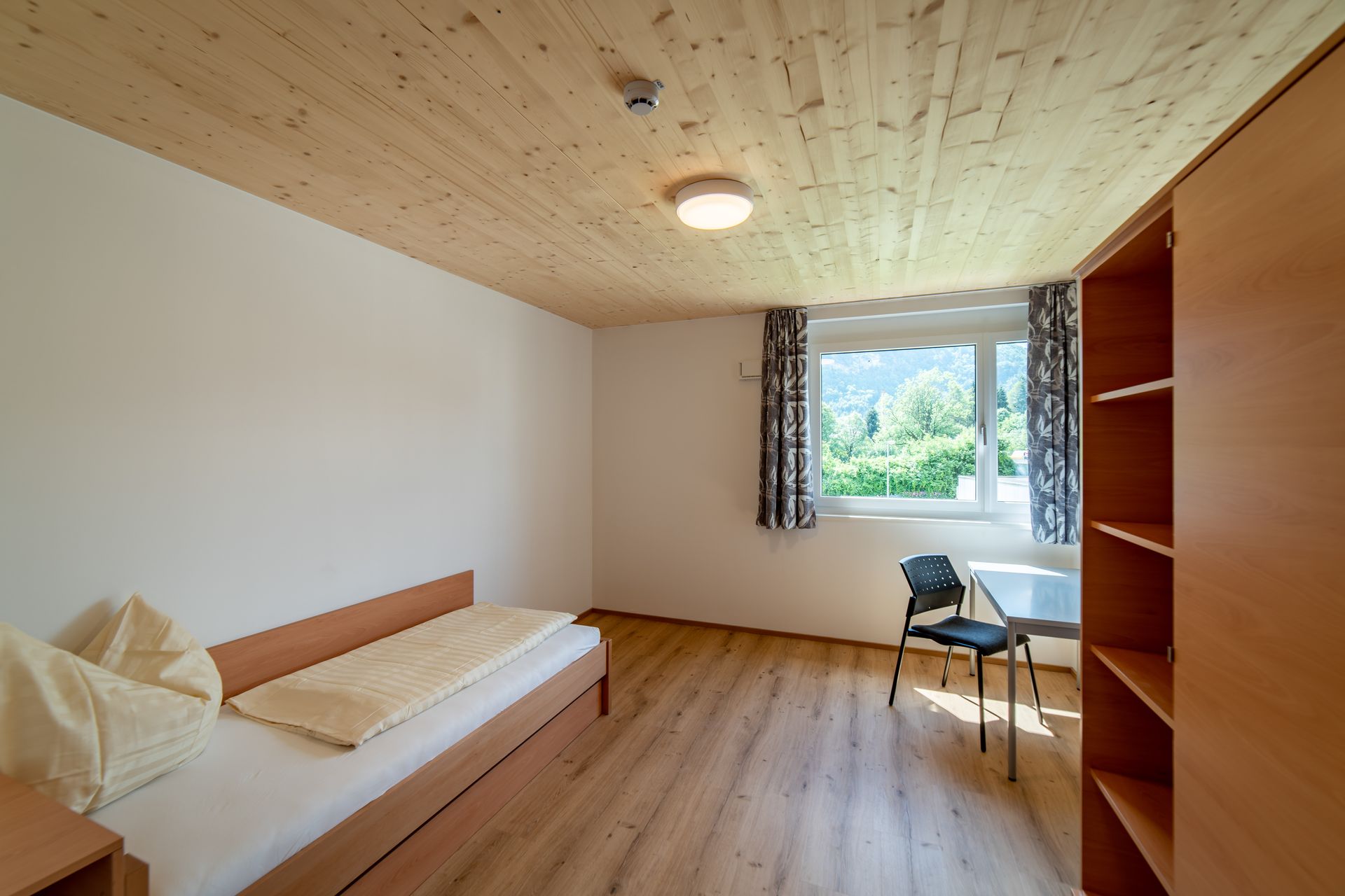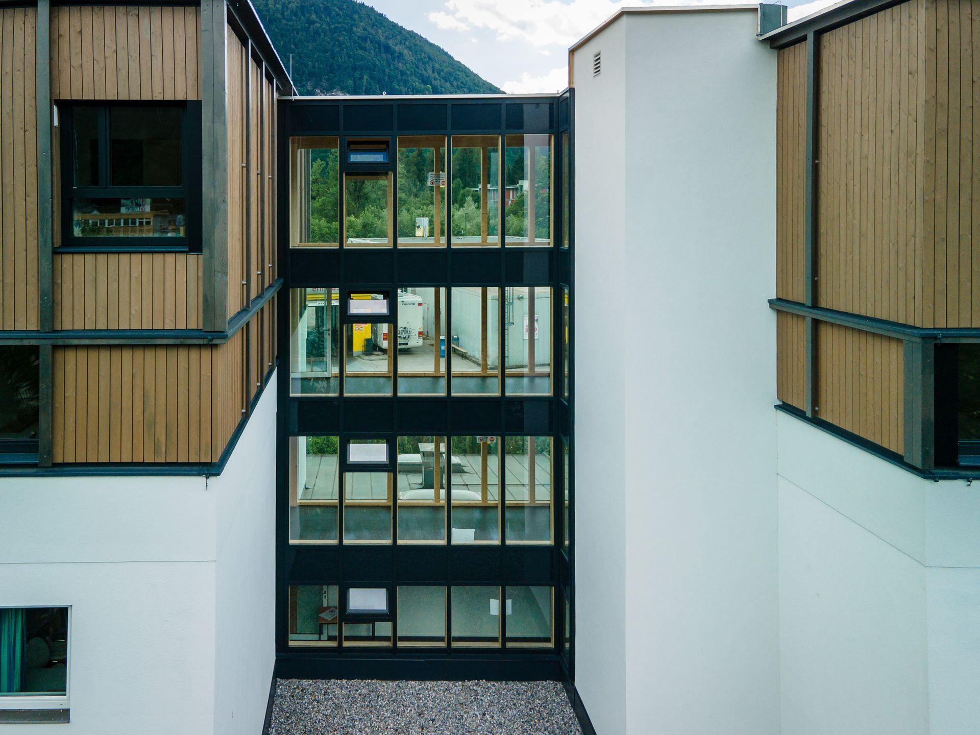 Die Fachhochschule Kufstein wächst und entwickelt sich innovativ weiter. Mit steigender Studentenzahl wächst auch die Nachfrage von bezahlbarem studentischem Wohnraum. Dementsprechend war die nächste logische Weiterentwicklung der FH-Infrastruktur die Erweiterung des Studentenwohnheimes. Es entstanden weitere 44 Wohneinheiten für die jungen Erwachsenen. Um keine weiteren Grundstücksflächen anzuschaffen, wurden die beiden Walmdächer des bestehenden Studentenwohnheims abgetragen und um zwei zweigeschoßige Aufstockungen aus Holz ergänzt. Der Erschließungsbereich im Erdgeschoß wurde vollkommen neugestaltet, und um einen Personenaufzug zwischen den Gebäuden ergänzt, welcher über eine Brücke aus Holz und Glas die oberirdischen Geschoße erschließt. Die Fassade der neu erbauten Geschoße wurde zur Gänze in Holz ausgeführt. Durch die wechselseitige Anordnung der Fenster und der stehenden und liegenden Lisenen entsteht eine sehr klar gegliederte Fassade. Durch Fassadenfertige Vorfertigung der Außenwände mit Fenster, Lüftungs- und Elektrotechnik gelang es das Gebäude großteils ohne Fassadengerüst zu montieren.