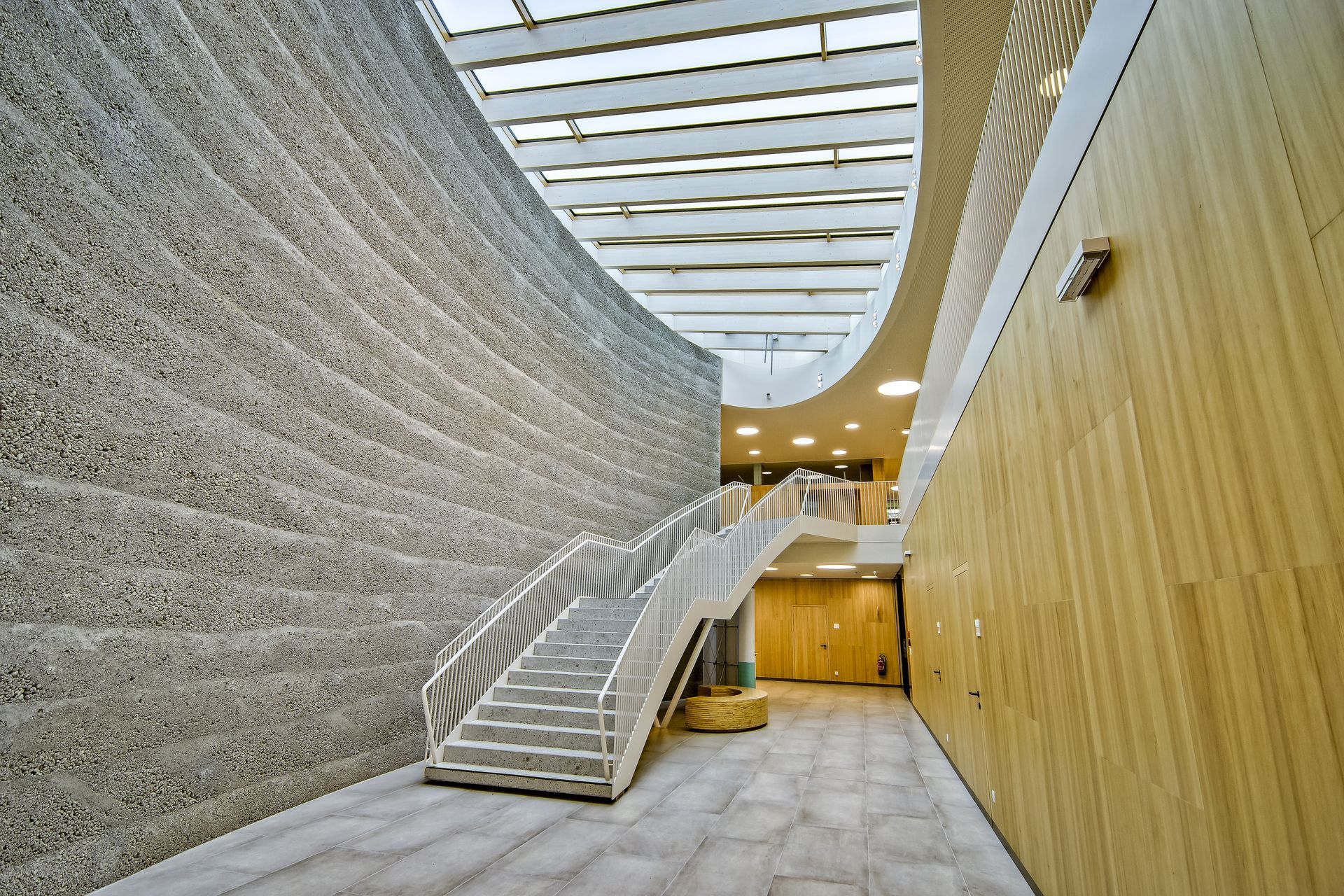 Die neue Krankenpflegeschule Kufstein definiert sich städtebaulich als Erweiterung bzw. räumlicher Abschluss des Areals rund um das Bezirkskrankenhaus Kufstein und schließt über einen Verbindungsgang im Obergeschoss an den zukünftig neu entstehenden Bettentrakt an. Das gesamte Gebäude wurde als zweigeschossiger Holzbau konzipiert, der über die geforderten funktionellen Abläufe eines modernen Schulbetriebs hinaus – in einem kompakten Volumen vereint – regionale Bautradition aufnimmt und somit materielle wie räumliche Bezüge zwischen Außen und Innen schafft. Typologisch vereint das Gesamtkonzept kurze Wegeführungen mit großzügigen Kommunikations- und Lernbereichen, die mit der veralteten klassischen Schularchitektur brechen und so wesentlich zum Erfolg der Lehr- und Lernziele der neuen Unterrichtskultur beitragen werden. Um einen reibungslosen Tagesablauf zu gewährleisten wurden Verwaltungs- und Pausenbereiche sowie die Garderoben der Schüler und Schülerinnen im Erdgeschoss untergebracht. Die Erschließung des Gebäudes erfolgt über einen Treppenlauf, der sich entlang einer vom Erdgeschoss bis ins 1. Obergeschoss führenden leicht geschwungenen Stampflehmwand schmiegt. Der gesamte innere Kern wird über ein großzügiges elliptisches Oberlicht erhellt. Die Räume des Obergeschosses (Klassen, Medienräume, Bibliothek) sind blockartig um den zentralen Kommunikationsbereich angeordnet. Unterbrochen werden diese durch Loggien, eine Außentreppe und verglaste Bereiche, die Ausblicke in die Umgebung schaffen und somit die Berglandschaft Kufsteins in das Innere der Schule transportieren.
