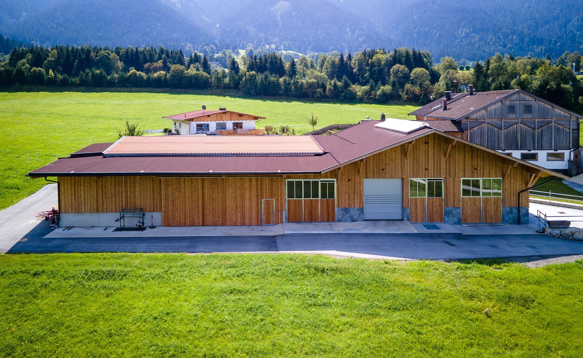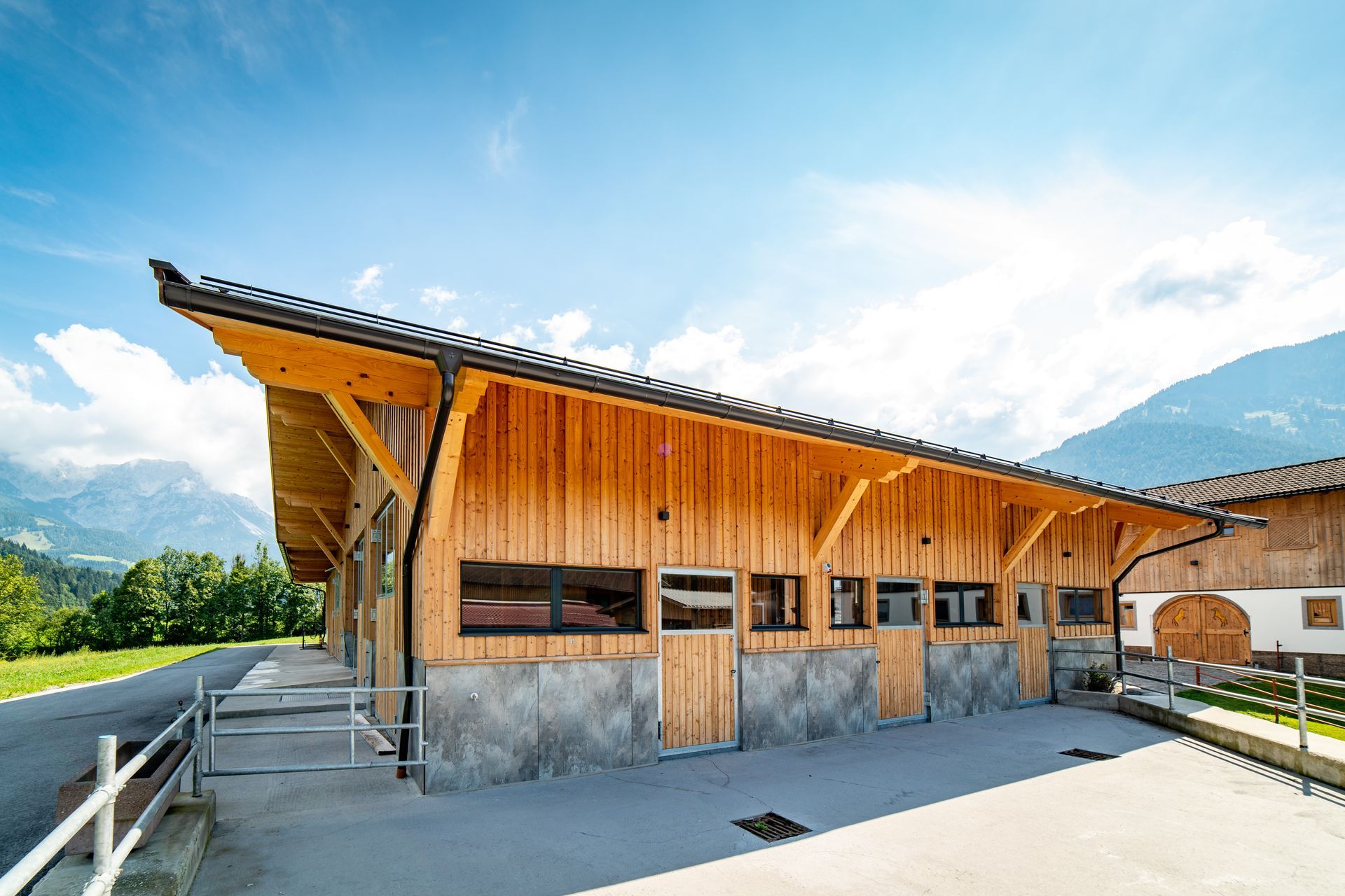 Der Stallanbau wurde ästhetisch an das Bestandsgebäude angefügt. Die Ausführung erfolgte mit Holzfachwerken in Satteldachform im Bereich des Stalles und mit Pultdachbindern im Bereich des Streu- und Heulagers. Die Giebel und Seitenwände wurden als Riegelkonstruktion ausgeführt und in unserer Werkhalle vorgefertigt. Die Fassade wurde in Lärche ausgeführt.